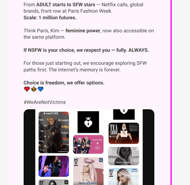 But a platform that's specifically made for NSFW content and a Founder who made her fortune from NSFW content and content creators, turning around and announcing it wants to see the end of new NSFW content creators and "elevate" all NSFW content creators to becoming SFW content creators...I don't love that.
