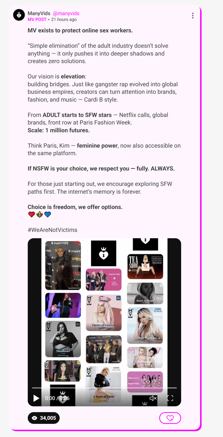 If they had announced they were setting up a separate site that was linked to ManyVids that was going to be purely SFW that would have been fine. A separate project that people can move to as and when they want to, great. But this slow conversion has me anxious and feeling threatened.